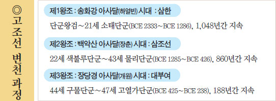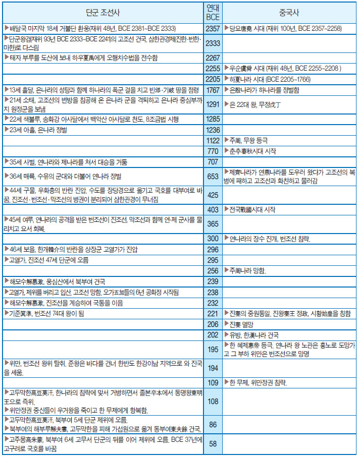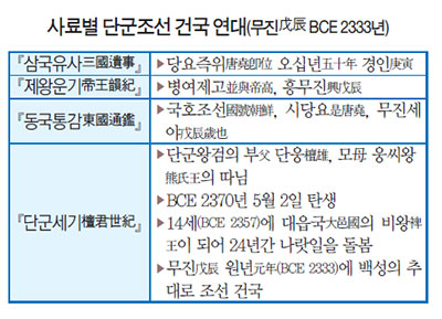 ◎단군조선이라 하면 뜻이 가장 선명할 것 같습니다. 내년부터 쓰일 우리 고교 교과서 3종에‘ 단군조선 성립 연대가 기원 전 2333년인데 그 근거가 삼국유사’라고 해서 논란이 일고 있습니다. 반면 교육부는‘ 1485년(성종 16년) 나온 우리 역사서 동국통감이 그 근거’라고 합니다. 이 대목부터 정리해주십시오. [표]