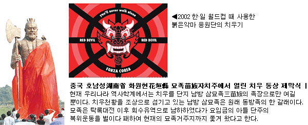 ◎배달국과 관련, 2002 월드컵 때 붉은악마 응원단 깃발에 무시무시한 치우의 얼굴(=鬼面)이 등장합니다. 바로 앞에서 종도사님께서도 치우천황이 배달국을 융성케 한 인물이 라 하셨는데, 이번 기회에 그가 어떤 인물인지 자세히 말씀해 주십시오.