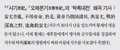 이는 관련된 여러 기록들이 밝히고 있는 엄연한 사실史實입니다.『 환단고기』 역시 탁록대전은 헌원이 치우에 대항해 벌어졌으며 전쟁의 승리자는 치우임을 명백히 기록하고 있습니다. 그런데도 한나라 때 역사가 사마천은 『사기』를 쓰면서 이를 뒤집어 버렸습니다.‘ 당시 유웅씨 헌원이 황제였는데 치우가 난을 일으켰다 잡혀 죽었다’(금살치우禽殺蚩尤)*고 왜곡한 것입니다.