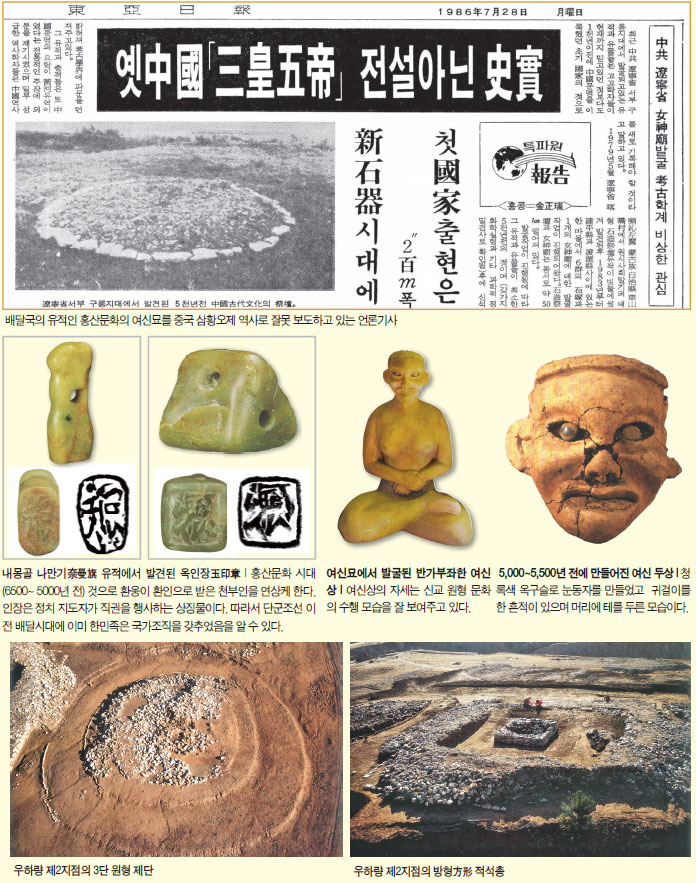 “단군조선의 유적, 유물도 그리 많지 않은 터에 그 이전 시대를 보여주는 ‘물증’들을 확보하기는 쉽지않았습니다. 그런데 지난 20세기초 중국 땅인 만리장성 이북 요하유역에서 홍산문화라는 새로운 유적이 발굴되고 그곳에서 지금까지 세계 고고학계와 역사학계를 깜짝 놀라게 하는‘ 사상 최초의, 가장 오래된’ 유물들이 쏟아져 나옵니다. 무엇보다도 한 국과 중국의 역사학계가 놀라고 있는데, 그 유적과 유물이 바로 한민족의 뿌리문화인 동이족의 것들이기 때문입니다. 중국이 자랑하는 고대 황하문명은 물론 세계 어떤 문명보다도 더 오래 전 연대의 것들입니다. 짧게 잡아도 5,500년전~6,000년전의 것입니다. 단군조선 시대보다 훨씬 더 거슬러 올라가는 것이죠.