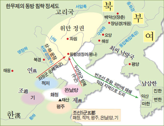 그런데도 나중에 우리나라 식민사학자들은 ‘위만이 단군조선을 계승하고 위만조선은 이내 한사군에 의해 끝났다’면서 그것을 기정사실화해서 교과서에 갖다 박아버렸습니다. 이병도는 위만이 상투를 틀고 흰옷을 입고 망명했다는 한나라 때 반고가 지은 『한서漢書』 「조선전」의 기록을 토대로 위만이 조선인이었다고 보고 위만정권을 위만조선이라 하였는데 『한서』의 기록에는 분명히 위만이 중국의 연燕나라 사람이라고 나옵니다. 위만의 정체를 잘못 파악한 것이죠. 위만은 어디까지나 옛 조선의 일부로 중국과 접하고 있던 서쪽의 번조선만을 차지했을 따름입니다. 조선을 계승한 나라들이 위만정권의 동쪽에 엄연히 존재하고 있었습니다. 북부여는 그 가운데 가장 큰 나라였습니다. 『한서』 「조선전」에는 ‘위만조선의 동쪽에 진번과 진국이 있으나 위만이 방해하여 중국의 천자와 교통할 수 없었다’는 기록이 있습니다. 이 땅 한반도에 조선을 계승한 여러 나라가 있었다는 것이지요. 그것도 나중에 한나라가 쳐들어와 위만조선이 문닫을 때까지 계속 그러했다는 것입니다. 이런 까닭에 단군조선이 위만에 의해 망했다거나 위만이 단군조선을 계승했다는 말은 전혀 사실이 아닙니다.”