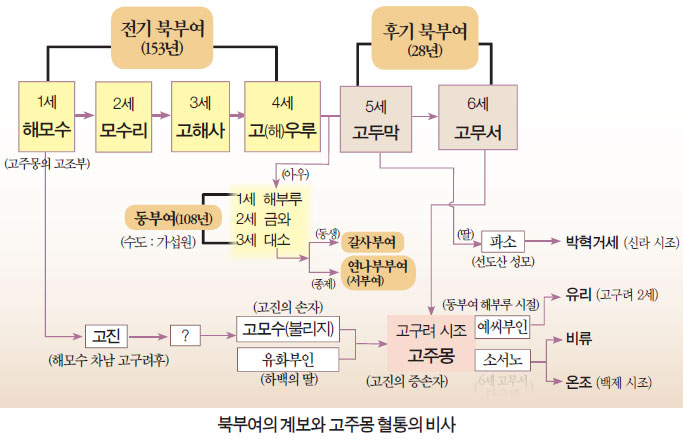 북부여의 제6세 고무서 단군은 우연히 알게 된 주몽을 범상치 않은 인물로 보고 자기 딸과 결혼시켜 사위로 삼았습니다. 아들이 없던 그가 재위 2년 만인 기원전 58년 세상을 뜨면서 통치권은 자연스럽게 사위인 주몽에게 넘어갔습니다.『 북부여기』의 이 같은 기록에 따르면 주몽은 결코 자신보다 200년 전 인물인 해모수의 아들이 될 수는 없습니다.”