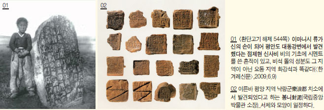 후한 시대의 유물들 대동강 유역에서는〈 점제평산군신사비○蟬平山郡神祠碑〉가 발굴되었는데“ ○和二年四月戊午, ?蟬長勃興”으로 시작된다. 첫 자는 읽을 수가 없으나 두 번째 和자가 들어간 중국 연호 가운데 가장 빠른 것은 후한後漢 장제章帝시대로서 CE 85년이다. 문제는 낙랑군의 속현 가운데 하나인 점제?蟬현이 있는데 이 비석이 발굴된 지역은 낙랑군 점제현이 틀림없다고 발굴자들은 말하고 있다.