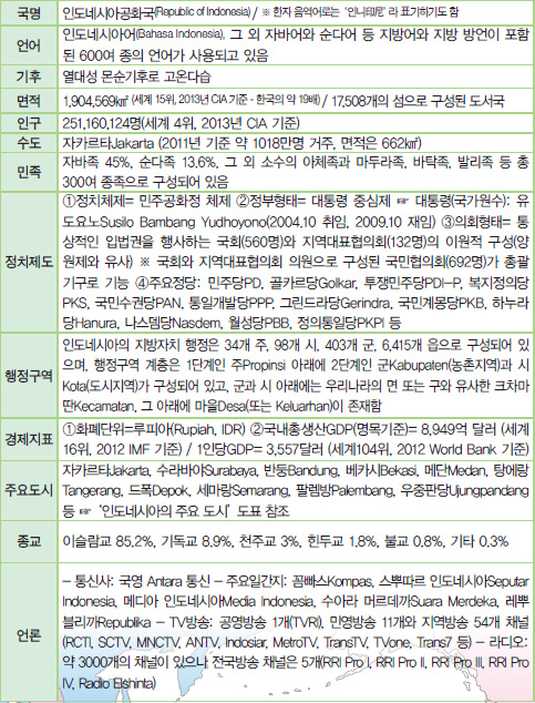인도네시아는 수많은 섬들로 이루어진 세계 최대의 도서국가이며, 지형적 복잡성만큼이나 인종, 언어, 문화도 매우 다채로운 나라이다. ‘다양성 속의 통일’을 기반으로 개방과 통합을 추구하는 인도네시아의 국정 철학은 국가를 상징하는 국장國章(Garuda Pancasila)에도 그대로 드러나 있다. 이질적인 요소들을 융합해 거대한 잠재력으로 다져나가고 있는 인도네시아의 오늘을 조명해 본다.