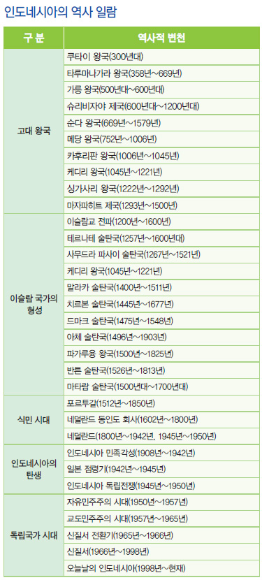 고대왕국 시대인도네시아의 역사는 4세기 무렵부터 등장하는 고대 왕조들로부터 출발한다. 300년대의 쿠다이 왕국에 이어 358년에 성립한 타루마너가라 힌두교 왕국이 자바 서부지역을 지배하였고 500년대에는 가릉 왕국이 존재하였다. 이어 689년 인도계 이주인들이 중심이 되어 건국한 불교 왕조 스리비자야Sriwijaya 왕국(중국의 문헌에는 실리불서室利佛逝, 삼불제三佛齊라고 기록됨)이 주로 수마트라의 팔렘방을 중심으로 13세기까지 번영을 누렸는데, 특히 강력한 해상세력을 형성하여 수마트라, 자바서부, 말레이 반도의 대부분을 손에 넣었으며 남중국해무역의 중심지로서 막강한 부를 자랑하는 국가로 발전하였다. 8세기에 자바섬의 중앙에 샤일렌다르라고 불렸던 왕조가 일어나 보로부두르와 같은 불교유적을 남겨놓았다. 이 왕조는 수마트라섬의 스리비자야 왕조와 밀접한 관계를 유지하였으며 9세기 중엽에 이 두 왕통王統이 합병됨으로써 한때 남중국해의 강대한 해상제국이 성립되었다.