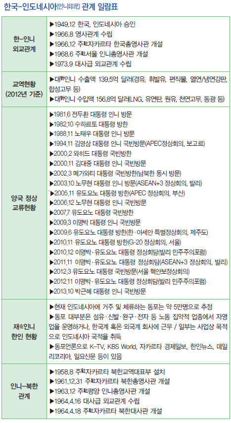 인도네시아는 한국을 자국 경제발전의 모델로 인식하여 양국의 경제협력 증진에 많은 관심을 보이고 있다. 2006년 12월 한국과‘ 전략적 동반자 관계’를 수립한 인도네시아는 국제연합(UN, United Nations), 아시아태평양경제협력체(APEC, Asia Pacific Economic Cooperation), 동남아시아국가연합(ASEAN, Association of Southeast Asian Nations), 아시아유럽정상회의(ASEM, Asia Europe Meeting)등과 국제기구에서 한국에 협조적 태도를 견지하고 있다. 북한과의 관계에 있어서는 전통적 우호관계국이며 비동맹 회원국으로서의 북한 입장을 의식해 대남북한 균형 기조를 유지한다는 원칙을 표명하고는 있으나 실질적 협력관계는 미미한 상황이다.