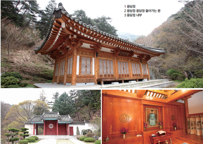 10분 정도 걸어 올라가니 큰 대문이 보였는데, ‘궁을’을 상징한 천도교 마크가 선명하다. 문을 지나 얼마를 걸어가니 용담정이 나타났다. 외관은 깔끔해 보였지만 그런 만큼 운치는 덜했다. 천주님을 만나기 전까지 세상에 나서지 않겠다는 대신사의 그 독한 구도의 열정은 찾기 힘들었다. 때마침 목이 마르던 차에 약수터가 보였다. 잘되었다 싶어 바가지로 한 모금 들이키면서 이 물이 대신사께서 하늘에 모신 그 청수물이 아니었을까 하는 억지스런 상상을 해보았다.