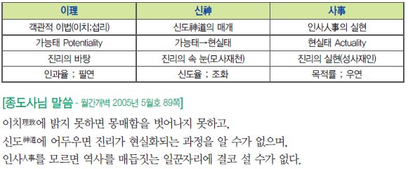 자연의 이법 속에서 신도의 손길에 의해 인간이 전개해 나가는 역사를 볼 줄 알아야 진리의 기본맥을 제대로 잡을 수 있다. 이 과정을 인식하는 주체는 바로 마음이다. 내 마음을 연다는 것은 곧 내 마음속의 천지 이법을 이해하고 깨닫는 것이다.