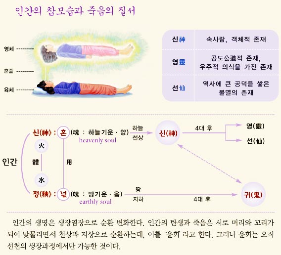 *사람에게는 혼(魂)과 넋(魄)이 있어 혼은 하늘에 올라가 신(神)이 되어 제사를 받다가 4대가 지나면 영(靈)도 되고 혹 선(仙)도 되며 넋은 땅으로 돌아가 4대가 지나면 귀(鬼)가 되느니라 (道典 2:118:2∼4)