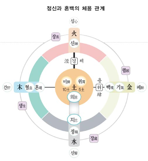 정이 수직으로 기화의 과정을 거쳐 내 몸의 하늘인 머리로 가서 신으로 발휘되면 양의 극에서 음이 태동하듯 신은 음화되어 혈을 만들며 통일, 완성되어 정수로 다시 탄생한다. 정·기·신·혈은 생명의 총수인 신이 주관하여 생장염장 이치에 따라 순환 생성되는 것이다. 정신과 기혈은 음양 짝이 되어 양은 음을 업고 오르며 음은 양을 안고 내려오면서 기혈의 조화와 정신의 통일을 이루어낸다. 토심土心[일심, 자연의 마음, 평화로움의 중도中道의식]은 이 순수한 정신과 기혈의 조화, 홍백의 안정 속에서 스스로 일어나는 것이다. 토심으로 인해 인간 몸에 생명력이 생성되고 조화를 이루어 궁극으로 인간이 만물과 하나 될 수 있다.