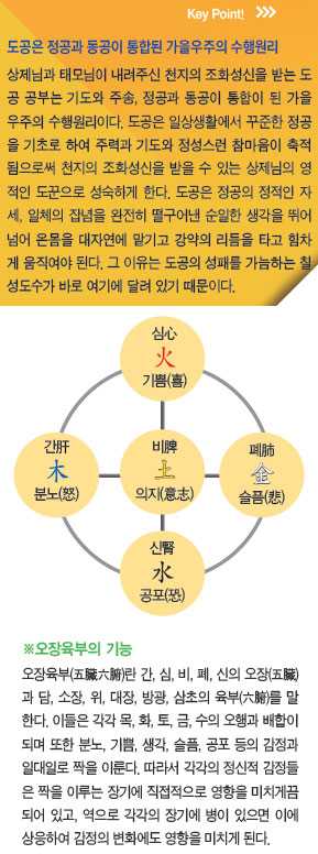 태모님께서 말씀하시기를 “제 오장육부 통제 공부로 제 몸 하나 새롭게 할 줄 알아야 하느니라.” 하시고“후천 천지사업이 지심대도술(知心大道術)이니라.