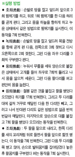 오금희란 ‘도인(導引)’이라고도 하는데, 요즘 말로 하면 일종의 건강체조라고 할 수 있다. 화타 자신은 오금희에 대해 이렇게 설명하고 있다.