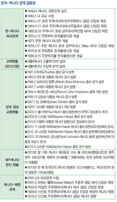 캐나다와 한국의 공식적인 관계는 1947년 캐나다가 한국의 선거과정을 감시하기 위한 유엔 한국임시위원단United Nations Commission에 참여하며 시작되었다. 캐나다는 1949년 한국을 국가로 공식 인정하였으며, 이후 1950년 한국전쟁 당시 외국 참전군으로서는 세 번째로 큰 규모인 26,791명의 캐나다 군을 유엔군의 형태로 파병하여 그 중 516명이 전사하였다. 한국전쟁이 끝난 후 지금까지 캐나다는 유엔군사정전위원회UN Military Armistice Commission 및 유엔사령부UN Command에 대한 참여를 통해 한반도의 안보를 유지하는데 기여하고 있다. 캐나다와 한국은 1963년 공식으로 수교를 맺었고, 10년 후인 1973년 처음으로 한국에 대사관을 개설하였다. 지난 2013년 한국과 캐나다는 각각 ‘한국의 해’와 ‘캐나다의 해’로 이름 지어 수교 50주년의 관계를 축하했고 한국전쟁 정전 60주년을 맞아 다양한 기념행사를 진행했다. 또한 캐나다는 정전기념일인 7월 27일을 한국전쟁 참전군인의 날(day of Remembrance in Honour of Veterans of the Korean War)로 지정하여 한국전쟁에 참전했던 캐나다 군인들을 기리는 날로 지정하였다.