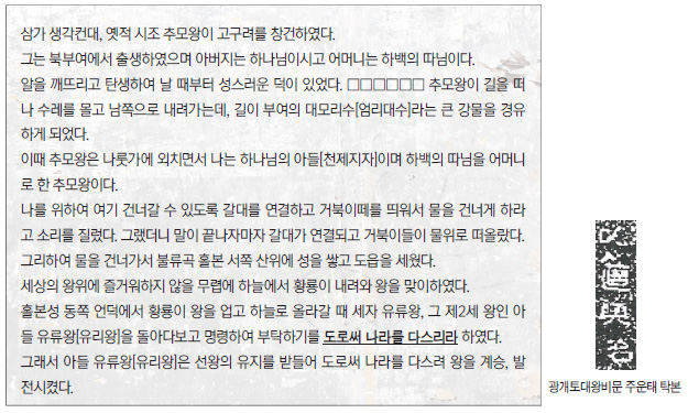 추모왕이 1세 왕이라면, 광개토대왕은 19세 왕이예요. 적어도 한 400년 내려왔죠. 그런데 중요한 게, 광개토대왕비에는 기원전에 있던 추모왕에 대한 건국의 정의와 통치의 기본이념에 대해서 썼어요. 그 기록을 우리가 지금 눈으로 볼 수 있는데 굉장히 좋아요. 그 첫머리를 간단히 하나 읽어보면요. [번역문 읽기]