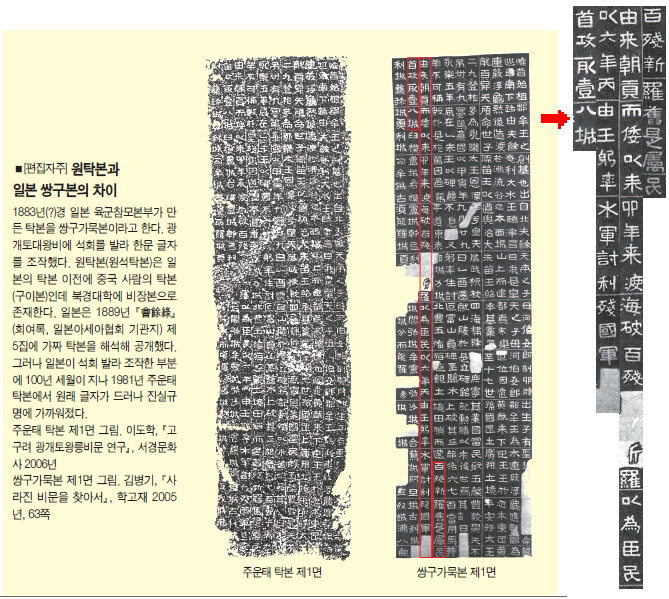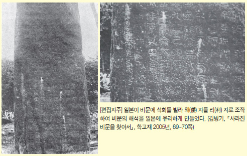 *일본 측은 광개토대왕 비문의 조작과 자의적인 해석을 통해 임나일본부설을 뒷받침하는 근거로 삼았다.