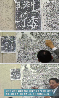 일본 사람들이 관학자들, 어용학자들하고 『會餘綠』(회여록)을 가지고 5년 동안 광개토대왕비 비문을 고쳤어요. 어떻게 하냐면 돌로 깨고서 여기에 백회, 석회를 발라가지고 굳잖아요. 그럼 글자를 만들어요. 그래가지고 탁본을 했다고. 그러니까 일본에 유리하게 글자를 전부 조작하고 만들어서 책을 낸 거에요. 지금도 광개토대왕비 현지에 가보면 회 바른 자취가 허옇게 있어요. 저희 비위에 맞도록 글자를 조작한 부분이야. [회 바른 자취그림 참조]
