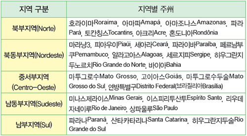 광활한 브라질 국토는 26개 주 및 1개 연방특별구의 행정구역으로 나뉘어지는데, 자연조건 등 지역적 차이에 따라 크게 북부 지역(전 국토 면적의 45%), 북동부지역(18%), 남동부지역(11%), 남부지역(7%), 중서부지역(19%)의 5개 지역으로 분류되고 있다.