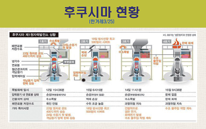 이번에 후쿠시마 사고*를 보니까 고준위 핵폐기물보다도 훨씬 심각한 문제가 발생할 수 있다는 걸 알았습니다. 재작년 3월 11일 지진 나고 12일부터 3일 연속 핵발전소가 터졌죠? 그 과정을 좀 볼까요.