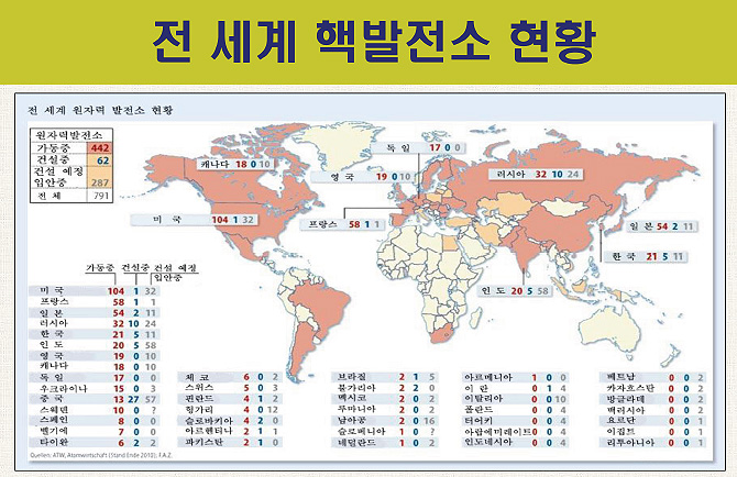 그런데 제스처도 취하지 않고 정책변화도 없는 나라가 있습니다. ‘후쿠시마 사고 났지만 우리나라는 그냥 갑니다.’ 이렇게 큰소리 치는 나라가 4개 있어요. 한국, 미국, 프랑스, 캐나다, 이 나라들이예요. 놀라운 나라들이죠.