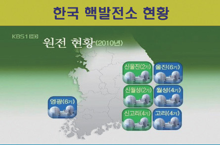 [그림] 한국은 영광에 6개, 울진에 6개 있습니다. 월성(경주)에 4개 있고, 고리(부산광역시 기장군)에 4개 있습니다. 그리고 8개 짓고 있었는데 신월성 2개 중 1개 완공됐고 신고리 4개 중 2개 완공됐습니다. 그래서 현재 23개가 가동중, 5개가 공사중인데 2,3년 내로 다 완공될 겁니다. 그러면 28개가 돼요. 거기다 삼척과 영덕에 새로운 부지 결정해놨죠? 거기 다 지어지고 고리에 조금 더 지을 땅이 있습니다. 모두 다 지어지면 앞으로 11년 후 42개가 됩니다. 그게 끝이 아니예요. 정부는 더 지을 계획도 갖고 있습니다. 50개 넘길 계획을 갖고 있어요. 그리고 텔레비전에서 광고하듯이 전세계 3위의 핵발전소 대국이 되겠습니다 라고 정부가 광고합니다. 전세계 3위, 뭘 의미합니까? 미국, 프랑스, 한국, 이렇게 가겠다는 거예요. 러시아 32개죠? 10년 내로 우리가 따라잡아요. 일본 54개였죠? 점점 줄 겁니다. 그러니까 한국은 3위가 될 것이다 라는 얘기입니다. 정부의 계획이 그렇고 정부의 홍보가 그래요. 저는 너무나 무서워요.