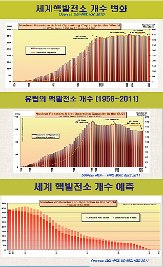[그림] 전세계 개수 한번 보십시오. 1954년부터 시작해서 개수가 쭉 많아졌습니다만 80년대 후반부터 25년 동안 전세계 핵발전소 개수가 전혀 증가하지 않았어요. 최근 한 10년 동안은 살살 줄고 있었어요. 어찌된 일일까요? 한국은 계속 지었는데 왜 전세계는 점점 줄고 있죠? 다른 나라는 개수를 줄이고 있기 때문이예요. 이거 보고 굉장히 놀랬습니다. 유럽을 보세요. 80년대 후반부터 어때요? 줄어요. 후쿠시마 사고 났죠? 그후로 팍팍 더 줄어요. 놀랍지 않습니까. 선진국인데 원자력을 점점 안하고 있어요. 미국은 어떨까요. 지난 30년 동안 핵발전소 1개도 안 지었어요. 그러나 오래된 거, 위험한 거, 하나씩 끄기만 했죠. 미국도 30년 내내 핵발전소 개수가 줄고 있었어요. 유럽과 미국은 핵발전소에서 손을 떼고 있죠. 그럼 뭐예요? 누군가 이만큼 채워주는 겁니다. 누가 채워요? 아시아의 3개 나라가 핵발전소를 계속 짓고 있어요. 어느 나라입니까. 한국, 중국, 인도입니다. 일본도 새로 지은 거 없어요.선진국이라고 이름붙은 나라들은 다 핵발전소를 줄이고만 있는데 한국 중국 인도 3개 나라가 빈 자리를 메꿔주고 있는 겁니다. 선진국이 손떼고 중진국이나 후진국이 시작하는 산업, 이걸 ‘미래 먹거리’라고 얘기해야 돼요? 아니죠. 사양산업이라고 부르는 겁니다. 선진국은 손떼고 후진국한테 떠넘기는 겁니다. 핵발전소는 사양산업이예요. 사양산업이었어요 25년간.