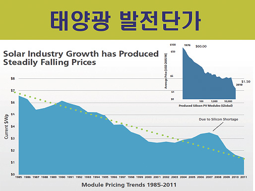 한국에 떨어지는 에너지는 공짜입니다. 세금도 안 붙습니다. 게다가 국산에너지입니다. 우리나라에 떨어지는 햇빛도 국산, 한국에 부는 바람도 국산이예요. 국산에너지를 개발해야 돼요. 그걸 다 버리고 있잖아요. 지금 얼마쯤 싸졌냐. 그러나 지금도? 아니죠.