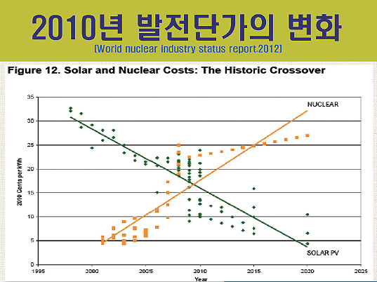 미국 현지에서 나온 평가를 보면 2010년 3년전 미국 노스캐롤라이나에서는 핵발전이 태양광보다 비싸졌어요! 지금은 어떨까요? 태양광이 핵발전보다 더싸요. 그러나 한국데이터는 어때요? 태양광이 핵발전보다 17배 비싸요. 누구 말이 맞을까요?