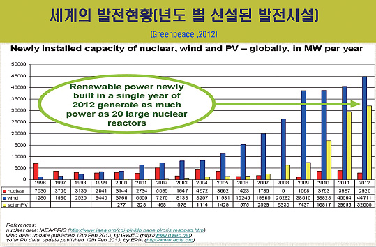 노란색 태양광 한번 보세요. 풍력보다 좀 늦게 시작했어요. 기술적으로 좀 어려웠지만 성장속도 더 빨라요. 2010년 일년에 이만큼 새로 만들었어요. 그 전에 다 합한 것과 비슷해요. 뭘 의미해요? 일년에 100% 성장한 거예요. 전세계 성장률 일년에 100%! 2011년, 2012년도 마찬가지. 작년도 올해도 마찬가지. 이걸 어떻게 설명해야 됩니까. 전세계에서 엄청나게 투자를 해요. 반면에 빨간색, 핵발전입니다. 1년에 이만큼씩 만들었어요. 어때요? 점점 더 많아지고 있어요? 원자력 르네상스 하고 있어요? 아니죠. 점점 줄고 있잖아요. 보이시죠. 2008년도 전세계에서 아무도 안 만들었어요. 2009년도 2010년도 누가 만들었나요? 한국이예요.