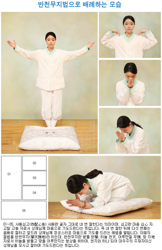 치성 때에는 배례(拜禮)하되 하늘을 받들고 땅을 어루만지는 반천무지법(攀天撫地法)으로 행하라. 이는 하늘과 땅과 사람이 합덕(合德)하는 이치니라. (9:67:1~2)