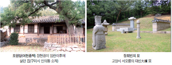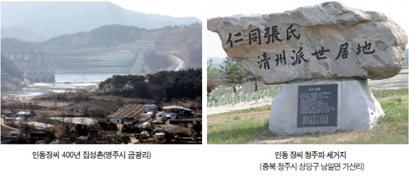 장금용 장금용을 시조로 삼는 문헌적 근거는 조선 선조 때 여헌旅軒 장현광張顯光이 기술한 「여헌록旅軒錄」이다. 여헌이 “인동 장씨의 시조는 대광공 장금용(所及知最先之祖大匡公)”이라 하고 “대광공의 부와 조부가 누구인지, 그 이상의 조상이 있었는지 세계가 전해오지 않아 알 수 없다(其上所未及知考又幾許代乎)”라고 하였다. 장금용은 고려 때 개국공신 삼중대광三重大匡(정일품의 품계)에 올라 신호위神號衛(국방을 맡은 대위중의 하나) 상장군上將軍(정삼품의 무관직으로 각 군영의 수직)을 역임했다. 전체 25개 파가 있는데 인동 향내 지명을 파명派名으로 하는 5개 파와 타 지역 명을 파명으로 20개 파로 나뉜다. 조선시대에는 정승 1명, 왕비 1명, 문과급제자 55명을 배출하였다. 14세손 장보張俌의 자손들까지는 인동·성주 등지에 살다가 18세 이후로는 예산·진주·하동·원주·상주·무안·은진·공주·서천 등지로 흩어졌다.