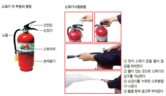 급할 때는 나도 소화관! 화재 발생 초기 단계에서 가장 큰 역할을 하는 것이 바로 소화기이다. 초기 진압 상황에서는 소방차만큼이나 큰 역할을 하기 때문에 그 중요성은 더할 나위 없다. 요즘은 일반 가정이나 차량에 소화기를 비치해 놓는 사람이 증가하는 추세이고 점포나 아파트는 소화기 비치가 의무화되어 있다. 하지만 소화기가 있어도 그 사용법을 모르면 막상 화재가 발생하였을 때 그야말로 ‘강 건너 불구경’을 하게 되는 경우도 발생한다. 또한 화재의 4분의 1은 가정에서 발생하며 주방에서 요리를 하거나 다리미를 켜두거나 전기장판이 과열되는 등 화재는 생각지 못한 일상에서 발생되므로 혹시 모를 화재에 대비해 소화기 한 대 정도는 비치해두는 것이 좋다. 일반 가정에서는 ABC분말 소화기를 사용한다. 이 소화기는 A(일반화재), B(유류화재), C(전기화재) 3가지 화재에 적합하도록 만들어졌다. 종이나 목재에서부터 기름과 전기에 이르기까지 가정에서 발생하는 대부분의 화재에 사용할 수 있다.