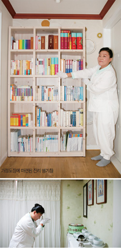 - 네 그렇지요. 사람을 살리는 장소가 외부에만 있는 것은 아니니까, 내 가정에서도 언제든지 진리를 전할 준비를 해두는 게 필요하다고 봐요. 그래서 집 거실에 5단 거치대를 가져다 놓고 진리서적과 홍보물을 꽂아 뒀어요. 주변 이웃이나 가정을 방문하는 정수기 기사님이나 인터넷 기사님, 세탁소 주인 아주머니, 관리사무소 근무하시는 분 등 대상은 많아요. 그런 분들을 초대하거나 업무 등으로 찾아오시면 꼭 진리 홍보물이나 책자를 드리고 대화를 해요. 여기 거실에서 바로 전해드리고 필요한 도담도 나누니까 자연스럽기도 하고 분위기도 좋아요. 여기 큰 책장도 두 개가 있는데, 통로 쪽 신단 방 입구 옆에 놓은 책장은 전체가 증산도 진리 서적과 자료로 채워져 있어요. 이렇게 정리를 해놓고 보니 품격까지는 아니더라도, 가가도장 홍보포교의 기본적인 틀이 갖춰진 기분도 들어요.