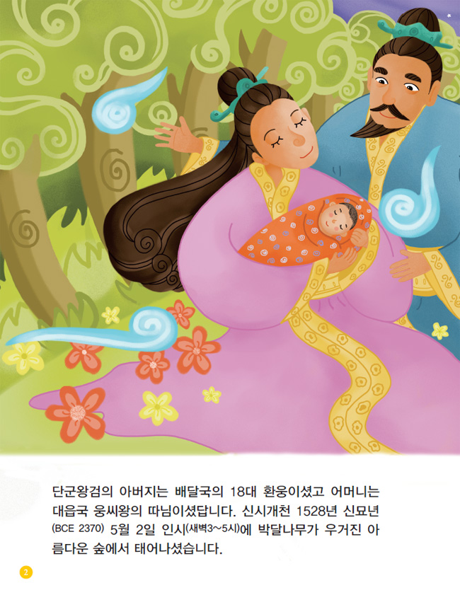단군왕검의 아버지는 배달국의 18대 환웅이셨고 어머니는 대읍국 웅씨왕의 따님이셨답니다. 신시개천 1528년 신묘년(BCE 2370) 5월 2일 인시(새벽3~5시)에 박달나무가 우거진 아름다운 숲에서 태어나셨습니다.