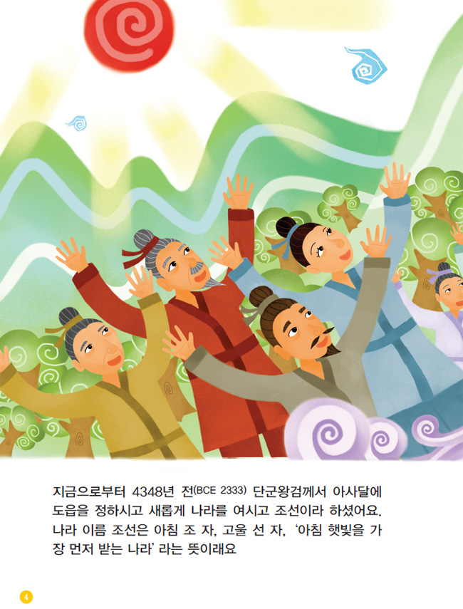 지금으로부터 4348년 전(BCE 2333) 단군왕검께서 아사달에 도읍을 정하시고 새롭게 나라를 여시고 조선이라 하셨어요.