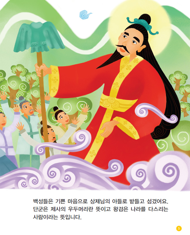 백성을 사랑하시는 마음으로 큰 덕을 베풀어 다스렸기 때문에 단군님의 어진 정치가 사방에 퍼져서 천하가 평화로워졌어요.