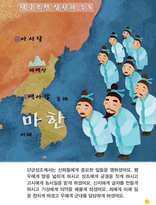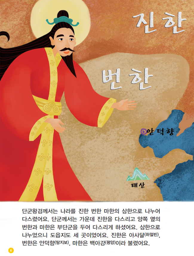 단군왕검께서는 나라를 진한 번한 마한의 삼한으로 나누어 다스렸어요. 단군께서는 가운데 진한을 다스리고 양쪽 옆의 번한과 마한은 부단군을 두어 다스리게 하셨어요. 삼한으로 나누었으니 도읍지도 세 곳이었어요. 진한은 아사달(하얼빈), 번한은 안덕향(탕지보), 마한은 백아강(평양)이라 불렸어요.
