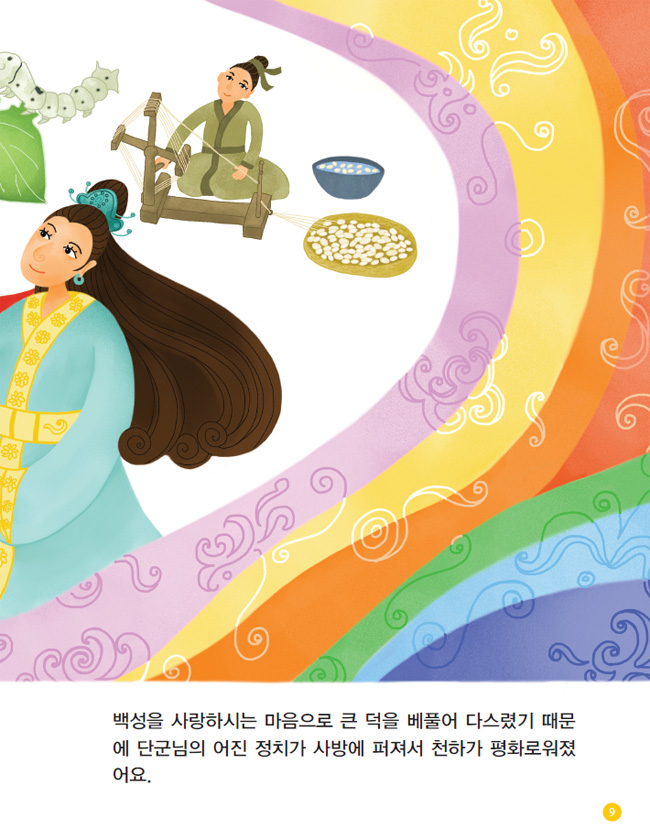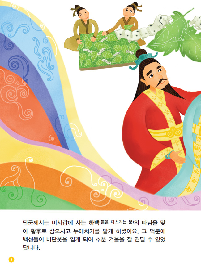 단군께서는 비서갑에 사는 하백(물을 다스리는 분)의 따님을 맞아 황후로 삼으시고 누에치기를 맡게 하셨어요. 그 덕분에 백성들이 비단옷을 입게 되어 추운 겨울을 잘 견딜 수 있었답니다.