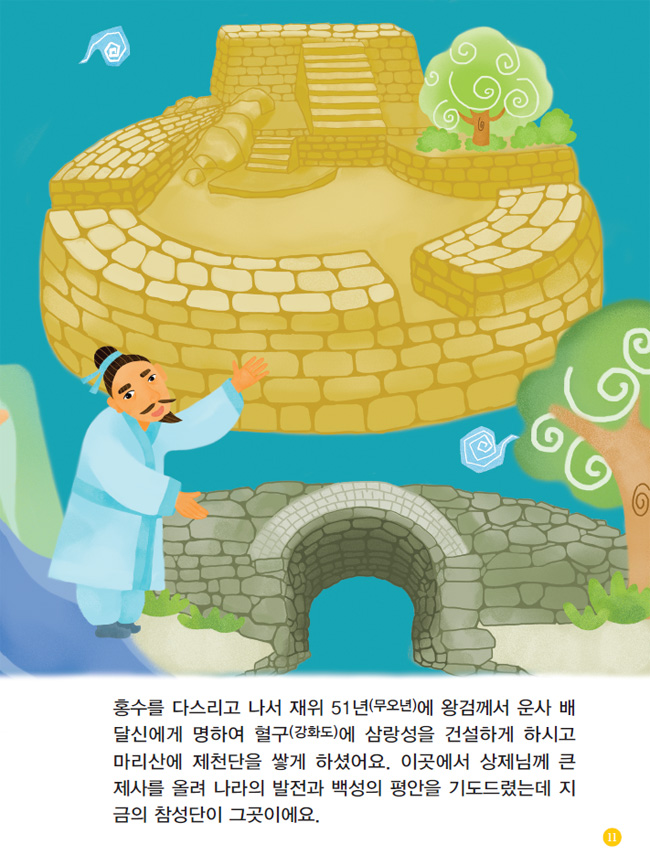 홍수를 다스리고 나서 재위 51년(무오년)에 왕검께서 운사 배달신에게 명하여 혈구(강화도)에 삼랑성을 건설하게 하시고 마리산에 제천단을 쌓게 하셨어요. 이곳에서 상제님께 큰 제사를 올려 나라의 발전과 백성의 평안을 기도드렸는데 지금의 참성단이 그곳이에요.