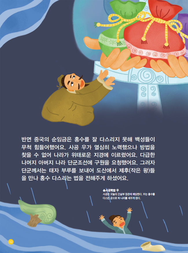 반면 중국의 순임금은 홍수를 잘 다스리지 못해 백성들이 무척 힘들어했어요. 사공 우가 열심히 노력했으나 방법을 찾을 수 없어 나라가 위태로운 지경에 이르렀어요. 다급한 나머지 아버지 나라 단군조선에 구원을 요청했어요. 그러자 단군께서는 태자 부루를 보내어 도산에서 제후(작은 왕)들을 만나 홍수 다스리는 법을 전해주게 하셨어요.