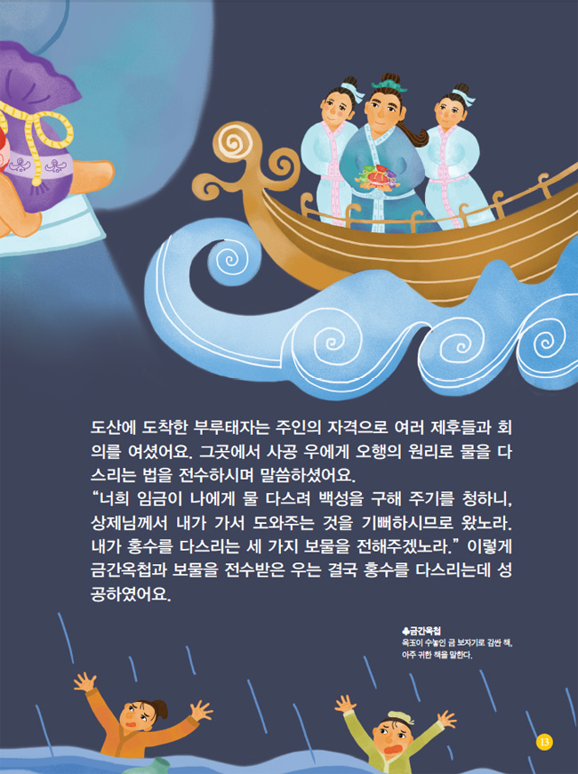 내가 홍수를 다스리는 세 가지 보물을 전해주겠노라.” 이렇게 금간옥첩과 보물을 전수받은 우는 결국 홍수를 다스리는데 성공하였어요.