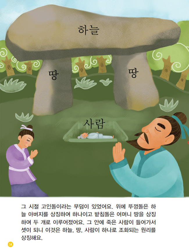 그 시절 고인돌이라는 무덤이 있었어요. 위에 뚜껑돌은 하늘 아버지를 상징하여 하나이고 받침돌은 어머니 땅을 상징하여 두 개로 이루어졌어요. 그 안에 죽은 사람이 들어가서 셋이 되니 이것은 하늘, 땅, 사람이 하나로 조화되는 원리를 상징해요.