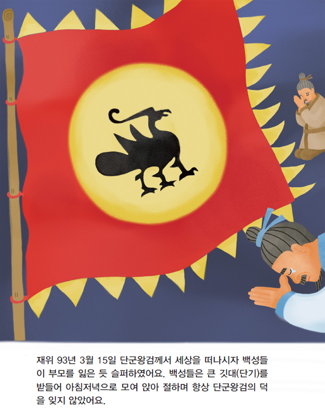 재위 93년 3월 15일 단군왕검께서 세상을 떠나시자 백성들이 부모를 잃은 듯 슬퍼하였어요. 백성들은 큰 깃대(단기)를 받들어 아침저녁으로 모여 앉아 절하며 항상 단군왕검의 덕을 잊지 않았어요.