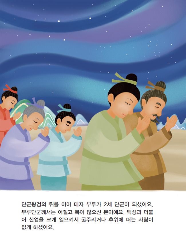 단군왕검의 뒤를 이어 태자 부루가 2세 단군이 되셨어요. 부루단군께서는 어질고 복이 많으신 분이에요. 백성과 더불어 산업을 크게 일으켜서 굶주리거나 추위에 떠는 사람이 없게 하셨어요.