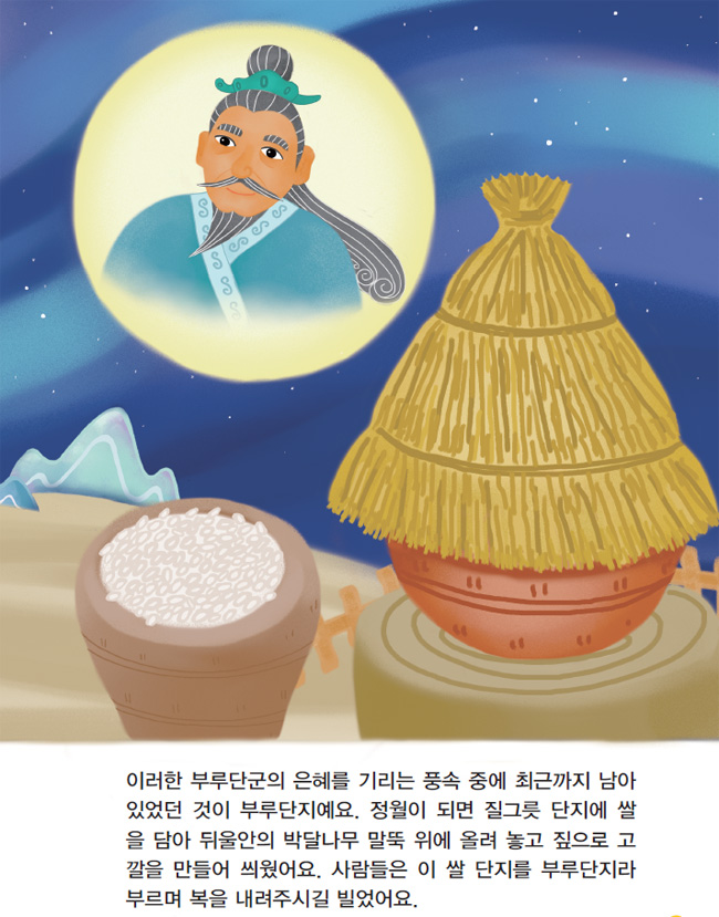 이러한 부루단군의 은혜를 기리는 풍속 중에 최근까지 남아 있었던 것이 부루단지예요. 정월이 되면 질그릇 단지에 쌀을 담아 뒤울안의 박달나무 말뚝 위에 올려 놓고 짚으로 고깔을 만들어 씌웠어요. 사람들은 이 쌀 단지를 부루단지라 부르며 복을 내려주시길 빌었어요.