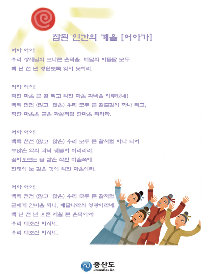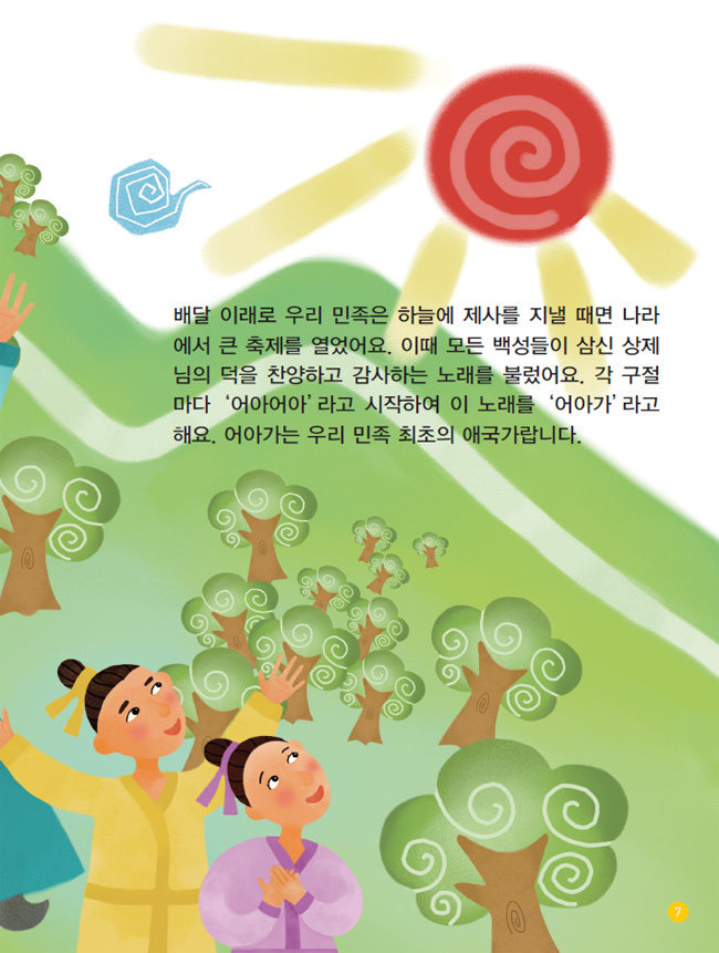배달 이래로 우리 민족은 하늘에 제사를 지낼 때면 나라에서 큰 축제를 열었어요. 이때 모든 백성들이 삼신 상제님의 덕을 찬양하고 감사하는 노래를 불렀어요. 각 구절마다 ‘어아어아’라고 시작하여 이 노래를 ‘어아가’라고 해요. 어아가는 우리 민족 최초의 애국가랍니다.