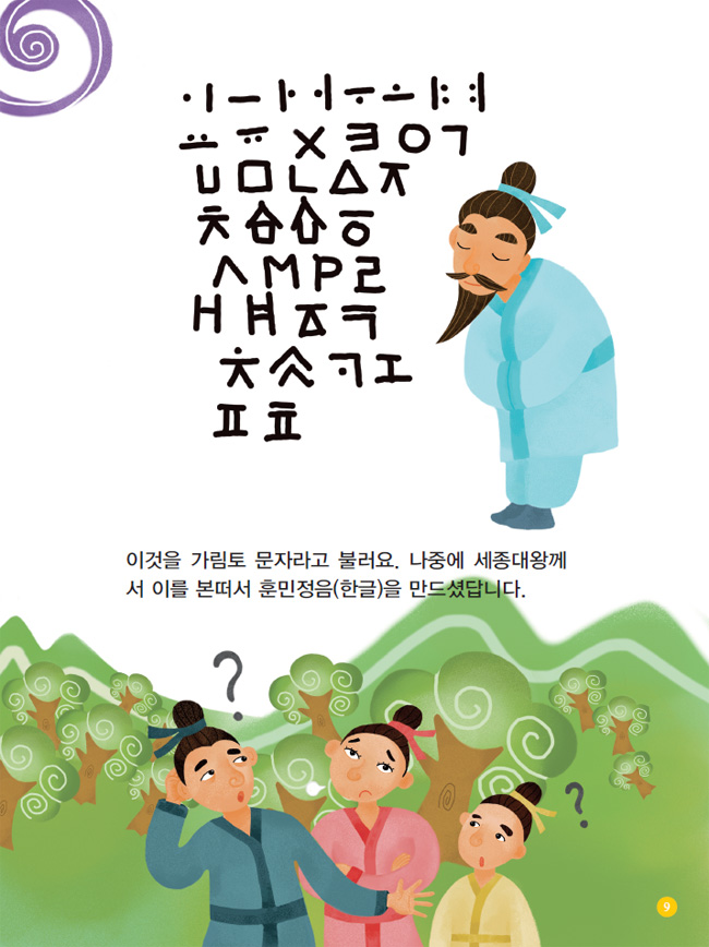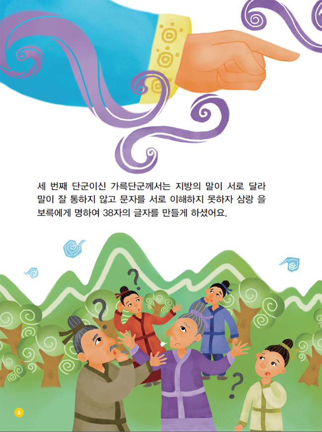 세 번째 단군이신 가륵단군께서는 지방의 말이 서로 달라 말이 잘 통하지 않고 문자를 서로 이해하지 못하자 삼랑 을보륵에게 명하여 38자의 글자를 만들게 하셨어요.
