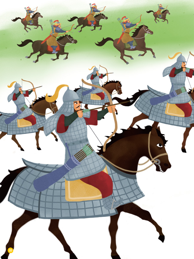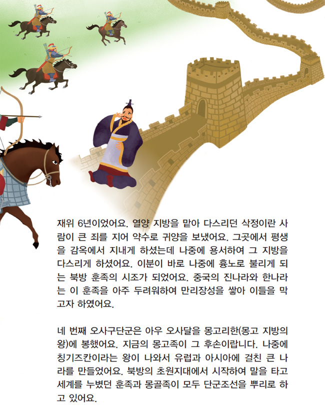 네 번째 오사구단군은 아우 오사달을 몽고리한(몽고 지방의 왕)에 봉했어요. 지금의 몽고족이 그 후손이랍니다. 나중에 칭기즈칸이라는 왕이 나와서 유럽과 아시아에 걸친 큰 나라를 만들었어요. 북방의 초원지대에서 시작하여 말을 타고 세계를 누볐던 훈족과 몽골족이 모두 단군조선을 뿌리로 하고 있어요.