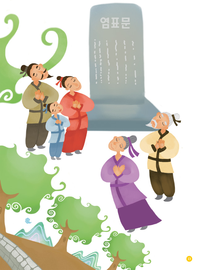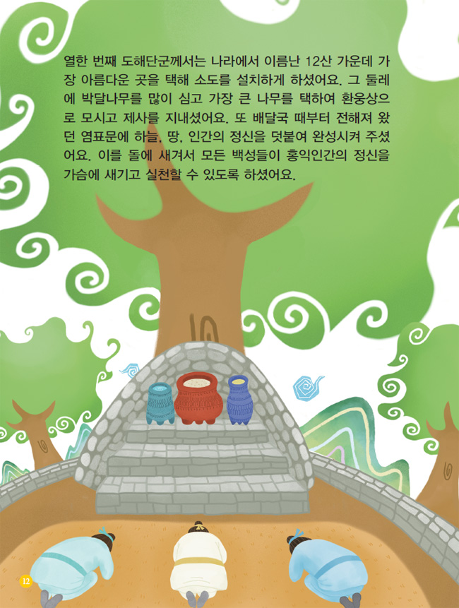 열한 번째 도해단군께서는 나라에서 이름난 12산 가운데 가장 아름다운 곳을 택해 소도를 설치하게 하셨어요. 그 둘레에 박달나무를 많이 심고 가장 큰 나무를 택하여 환웅상으로 모시고 제사를 지내셨어요. 또 배달국 때부터 전해져 왔던 염표문에 하늘, 땅, 인간의 정신을 덧붙여 완성시켜 주셨어요. 이를 돌에 새겨서 모든 백성들이 홍익인간의 정신을 가슴에 새기고 실천할 수 있도록 하셨어요.