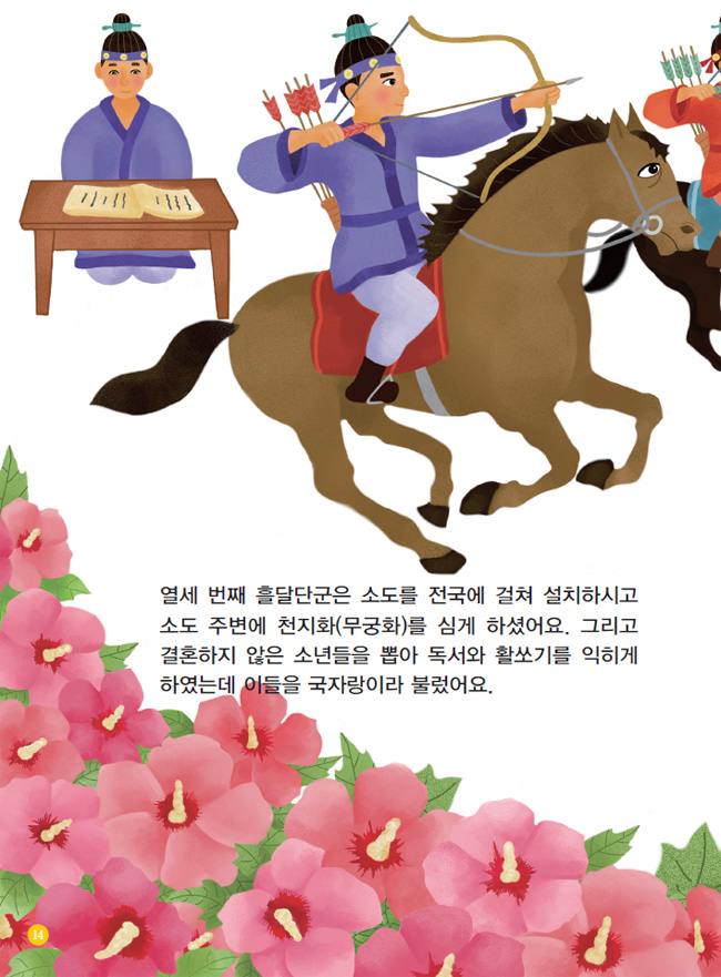 열세 번째 흘달단군은 소도를 전국에 걸쳐 설치하시고 소도 주변에 천지화(무궁화)를 심게 하셨어요. 그리고 결혼하지 않은 소년들을 뽑아 독서와 활쏘기를 익히게 하였는데 이들을 국자랑이라 불렀어요.