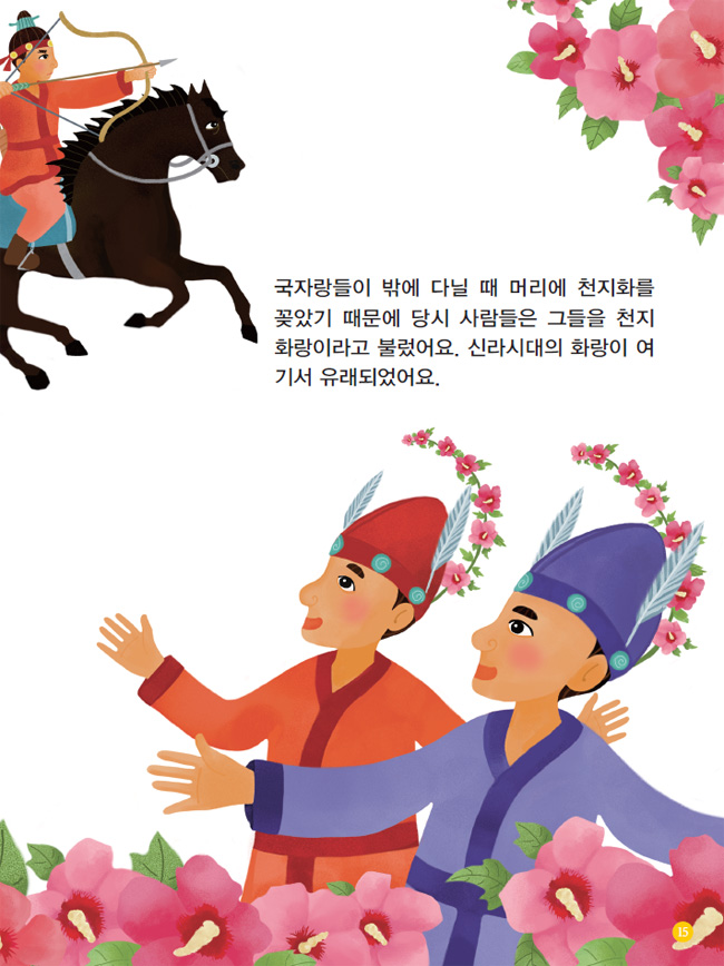 국자랑들이 밖에 다닐 때 머리에 천지화를 꽂았기 때문에 당시 사람들은 그들을 천지화랑이라고 불렀어요. 신라시대의 화랑이 여기서 유래되었어요.